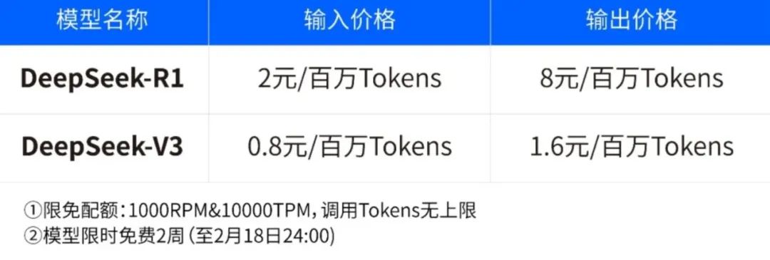 44分钟后,百度智能云也宣布了其千帆平台正式上架DeepSeek-R1和DeepSeek-V3模型,公布输入和输出价格,并从上线到2月18日24点模型限时免费。