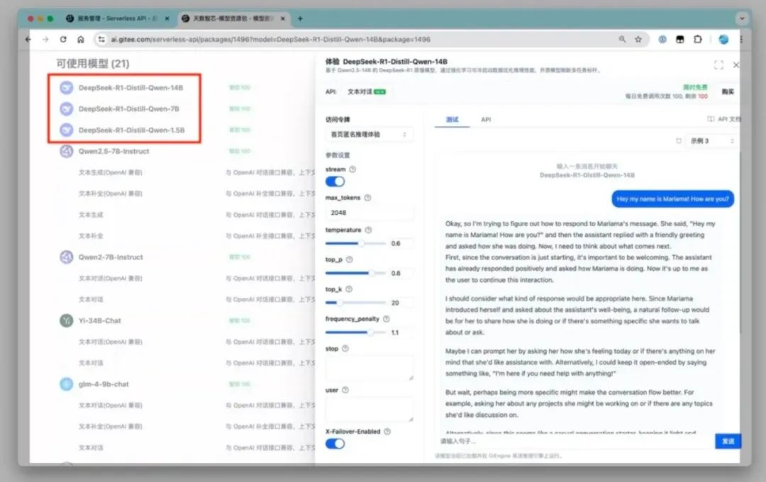 DeepSeek-R1模型+沐曦曦云GPU+Gitee AI平台,实现了从芯片到平台,从算力到模型,全国产研发、中国制造。官方称之为“100%国产AI的力量”。昨日,天数智芯、摩尔线程、海光信息接连宣布对DeepSeek模型的支持。天数智芯宣布与Gitee AI合作,仅用时一天,就完成了与DeepSeek-R1模型的适配工作,并已上线多个大模型服务,包括1.5B、7B、14B等版本。