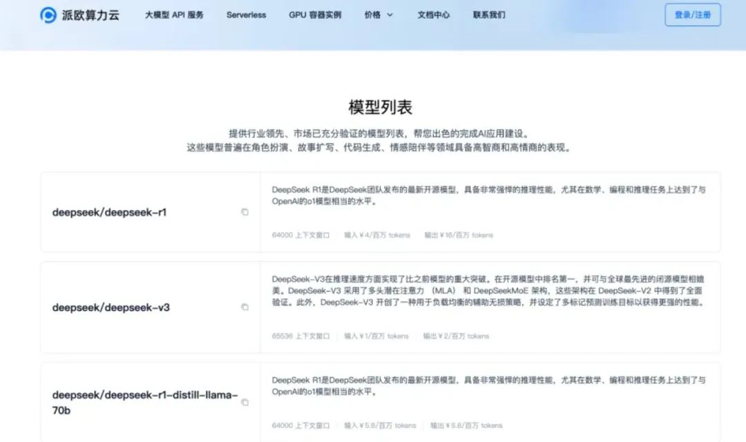 同日,腾讯云TI平台宣布上架DeepSeek系列模型,包括“满血”的V3、R1原版模型和基于DeepSeek-R1蒸馏得到的系列模型,全面支持DeepSeek系列模型的一键部署,并限时开放了R1模型的免费在线体验。除了六大云巨头外,国内AI基础设施企业无问芯穹更是早在1月28日除夕一大早就宣布了其Infini-AI异构云对DeepSeek-R1-Distill 32B模型的支持。PPIO派欧、云轴科技则同在2月2日官宣对于DeepSeek模型的支持。PPIO派欧算力云支持了DeepSeek-V3、DeepSeek-R1、蒸馏模型DeepSeek-R1-Distill-Llama-70B,模型价格与官方价格保持一致。