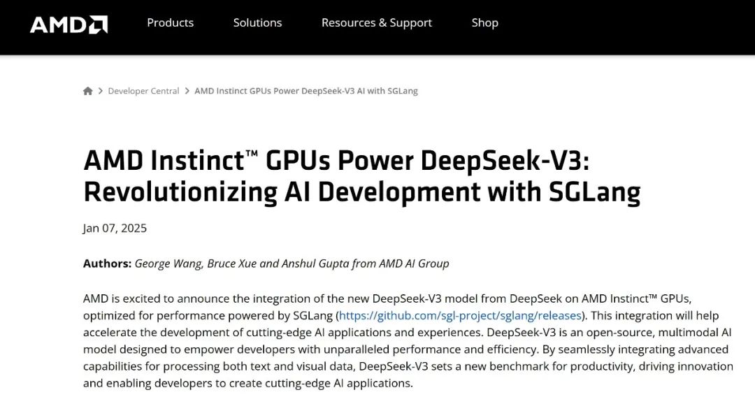 国内外芯片厂商纷纷快速响应,宣布对于DeepSeek模型的支持。海外芯片三巨头中,AMD响应最积极,早在1月25日新年前就官宣将DeepSeek-V3模型集成到了Instinct MI300X GPU上。在X平台发文中,AMD特别感谢了DeepSeek和SGLang团队的密切配合。