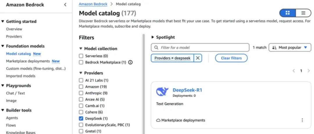 海外市场,全球第一大云巨头AWS也在1月31日官宣DeepSeek-R1模型的全面上线。用户可在Amazon Bedrock Marketplace和Amazon SageMaker JumpStart上部署DeepSeek-R1模型;在Amazon Bedrock上自定义导入DeepSeek-R1-Distill模型并在Amazon EC2 Trn1实例上部署DeepSeek-R1-Distill模型。