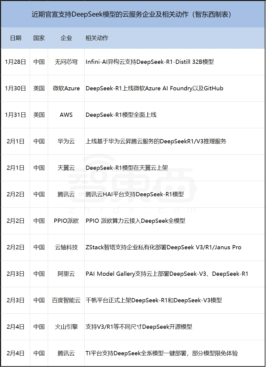 ▲近期官宣支持DeepSeek模型的云服务及AI基础设施企业(按照时间顺序排列,信息来自各家官网、官方媒体平台)