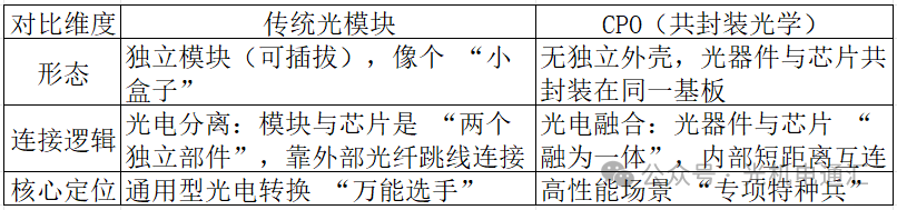 简单说,传统光模块是“独立作战的光电转换单元”,CPO 是 “与芯片绑定的集成化方案”,本质是 “基础款” 和 “进阶款” 的关系~