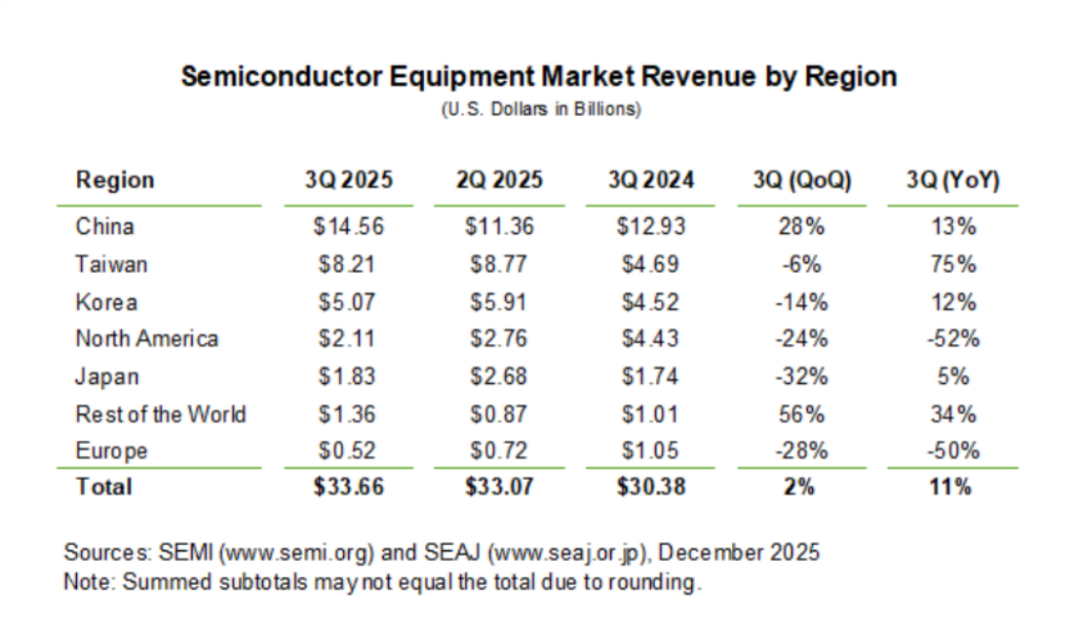 2025 年第三季度,半导体设备市场销售额排名前列的地区依次为:中国大陆(145.6 亿美元)、中国台湾(82.1 亿美元)、韩国(50.7 亿美元)、北美(21.1 亿美元)、日本(18.3 亿美元)、世界其他地区(13.6 亿美元)和欧洲(5.2 亿美元)。